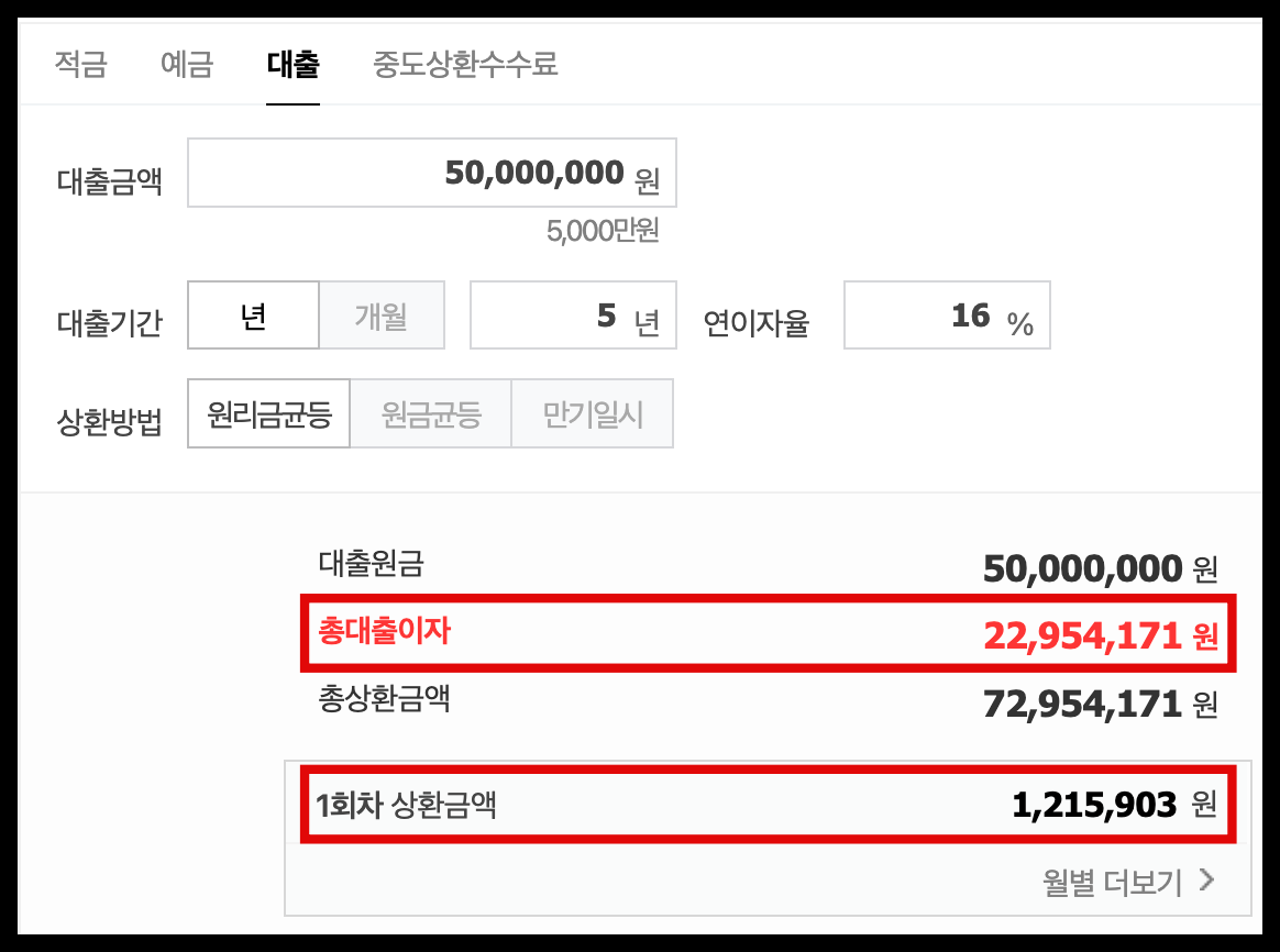 대출금 5000만원, 기간 5년, 금리 연 16.0%, 원리금균등분할상환 조건으로 월상환금을 계산해 보겠습니다.
