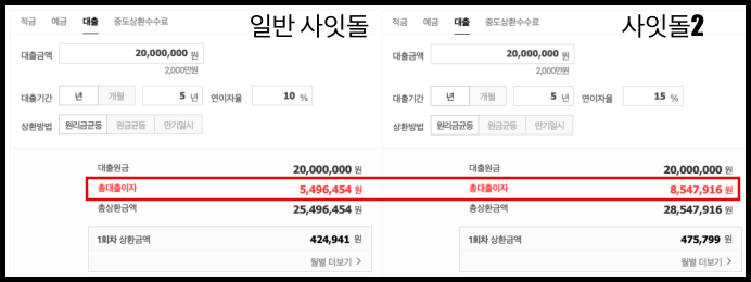 두 사잇돌 대출의 이자 비교를 [대출금 2000만원, 기간 5년, 원리금균등분할방식] 조건으로 비교하겠습니다. 일반 사잇돌 대출의 금리는 10%, 사잇돌2 대출은 15%를 적용했습니다.