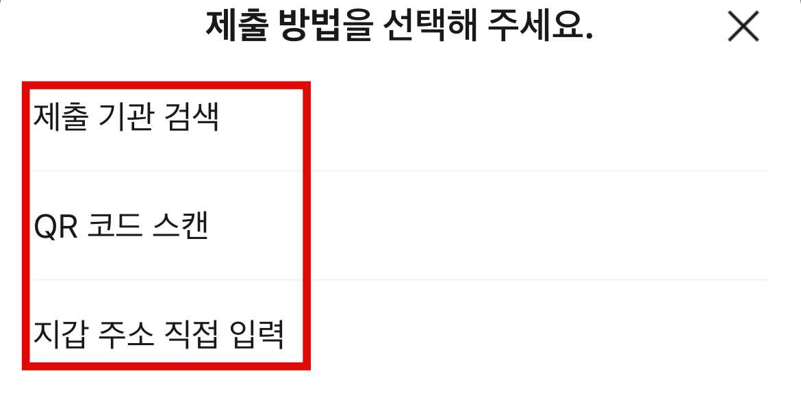 2. [제출하기]를 눌러주면 전자증명서 제출 방법을 선택할 수 있습니다. [제출 기관 검색 / QR 코드 스캔 / 지갑 주소 직접 이력] 중 선택하시면 됩니다.