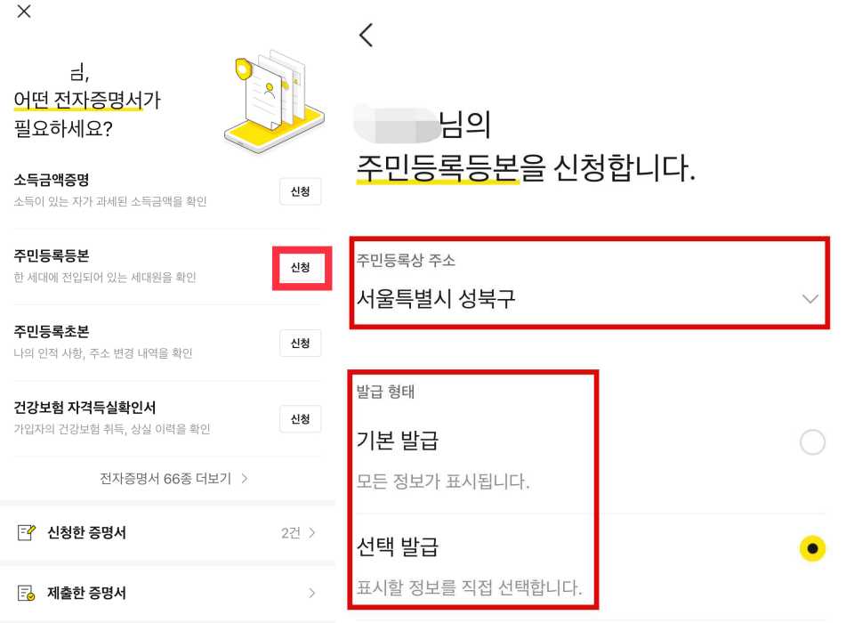 카카오톡을 활용한 전자증명서 발급 방법은 주민등록등본 발급을 예시로 알려드리겠습니다.