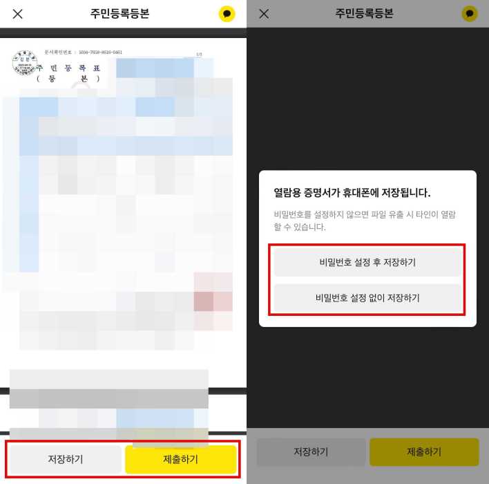 3. 저장하실 증명서를 눌러줍니다. 비밀번호를 설정할 수 있는 메뉴가 팝업됩니다. 본인 정보 보호를 위해 비밀번호를 설정하고 저장하시는 것을 권장드립니다.
