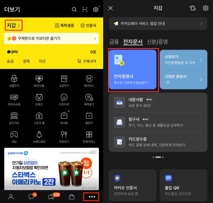 1. 카카오톡 실행 후 [하단 더보기 탭 - 지갑 - 전자문서 - 전자증명서]로 들어갑니다.