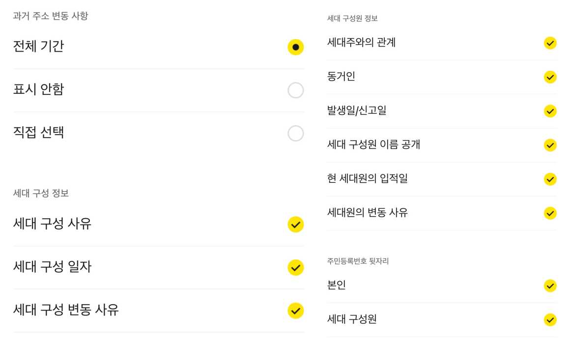| 과거 주소 변동 사항 | 전체기간 / 표시안함 / 직접선택 |